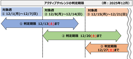 判定期限は、対象のアクティブチャレンジ(月曜日~日曜日)の翌土曜日23時59分です。